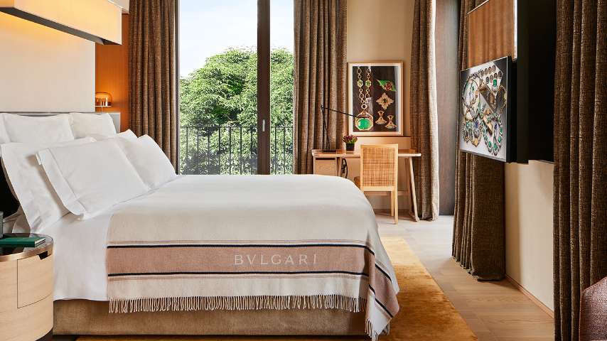 Le Bvlgari Hotel Milan repose sur un équilibre délicat entre le rigoureux design de l'espace et la richesse des atmosphères. Marbre noir du Zimbabwe, pierre de Vicence et d'Afyon, tek, rouvre et bois de chêne : des matériaux nobles et rares créent d'inédites combinaisons de surfaces et d'harmonies chromatiques, dans un parfait équilibre entre la rigueur de l'espace et l'évocation d'atmosphères rehaussées de mobilier et de finitions, conçues par le ACPV ARCHITECTS Antonio Citterio Patricia Viel. Situé Via Gabba, le bâtiment date des années 50 et vient d'être rénové avec du papier peint en lin couleur crème, un nouveau mobilier de la collection Flexform d'Antonio Citterio et Maxalto, ainsi que des bibliothèques B&B modulaires. Des esquisses encadrées de bijoux emblématiques de Bvlgari ornent désormais toutes les chambres, tandis que les suites proposent une collection de livres d'art et de design.